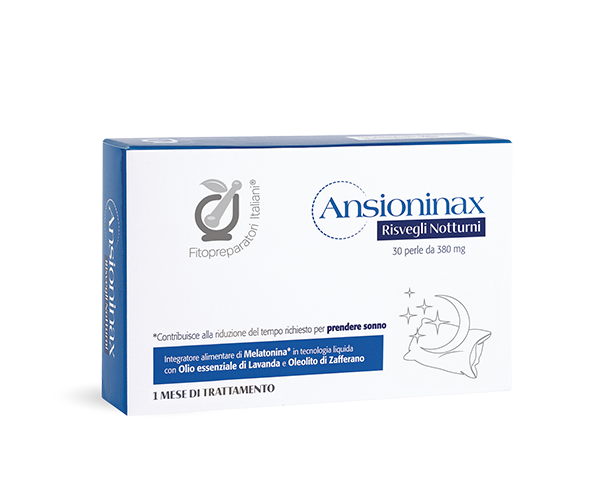Integratore alimentare di Melatonina in tecnologia liquida con Olio essenziale di Lavanda e Oleolito di Zafferano. La Melatonina contribuisce alla riduzione del tempo richiesto per prendere sonno. L’effetto benefico si ottiene con l’assunzione, poco prima di coricarsi, di 1 mg di Melatonina (pari a 1 perla di Ansioninax Risvegli Notturni). La Lavanda è utile per conseguire uno stato di rilassamento.